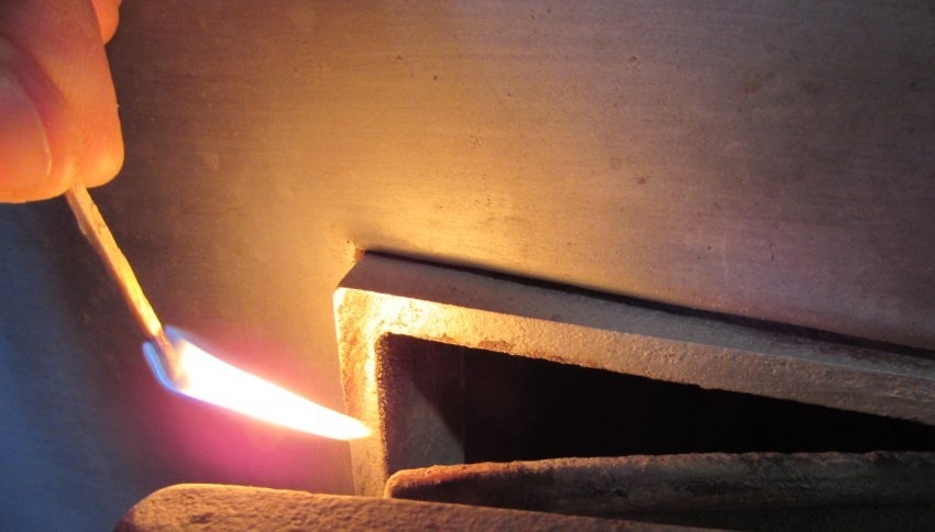 - за допомогою свічки або сірники. Необхідно піднести запалену свічку або сірник до топкової в опалювальному приладі. За напрямом полум’я визначається наявність руху повітря, при правильній роботі витяжки вогник потягнеться в топку, а якщо полум’я не колишеться або відхиляється у бік приміщення, то це ознака відсутності тяги;