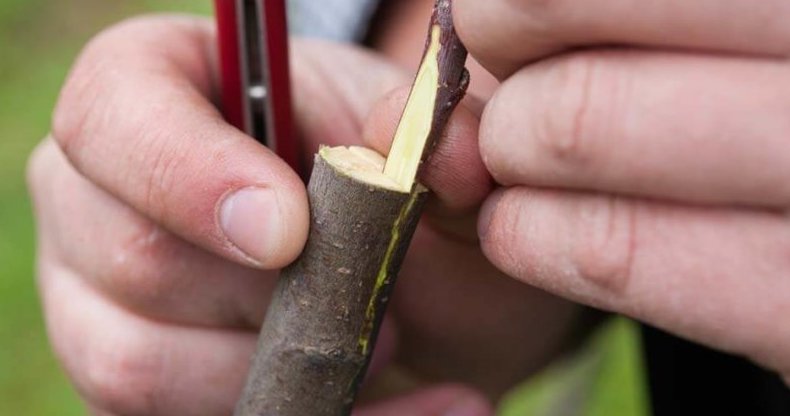 При товщині черешка, який у кілька разів менше товщини підщепи, вдаємося до процедури, що називається, в розщіп. У рослини, на місці щеплення, робимо надріз, і по центру виробляємо неглибокий розщіп. В отриманий розріз акуратно, не торкаючись до зрізу руками, встановлюємо держак, його впритул зафіксуємо до краями зрізу.