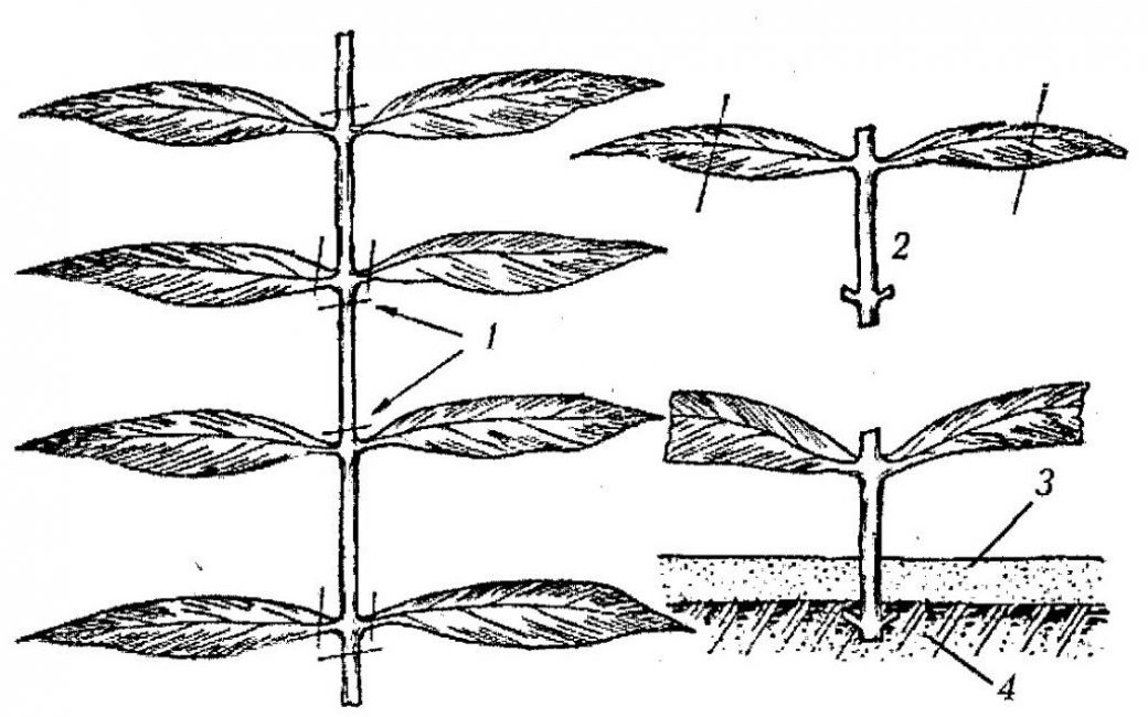 Зрізають верхні частини пагонів. На черешку, повинно бути не менше трьох листочків