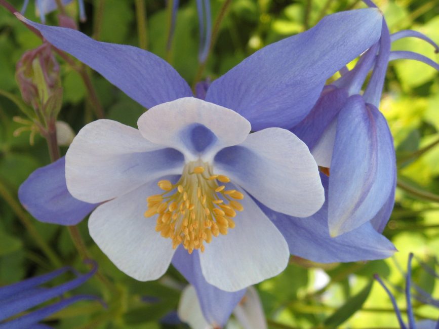 - Квіти великі, діаметром 7 – 8 див. блакитні Пелюстки, мають загнуті шпорці.