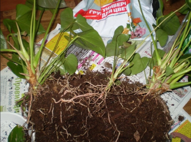 - Ділення кореня. Традиційно застосовується під час пересадки. Корінь материнського рослини поділяється на кілька рівних частин, кожна з яких повинна мати мінімум 2-3 аркуша. Грунт, в яку рослина пересідає, не обов’язково повинна мати такий же склад, як і материнська