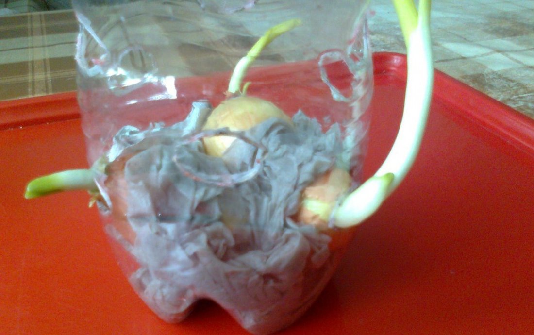 Якщо в плани господині не входить організація великої плантації, достатньо підібрати склянку, кухоль, банку і налити туди води, на третину, заповнивши тару. Приміщення туди ганчір’яної серветки дозволить рідини по ній добиратися до цибулевих коренів.
