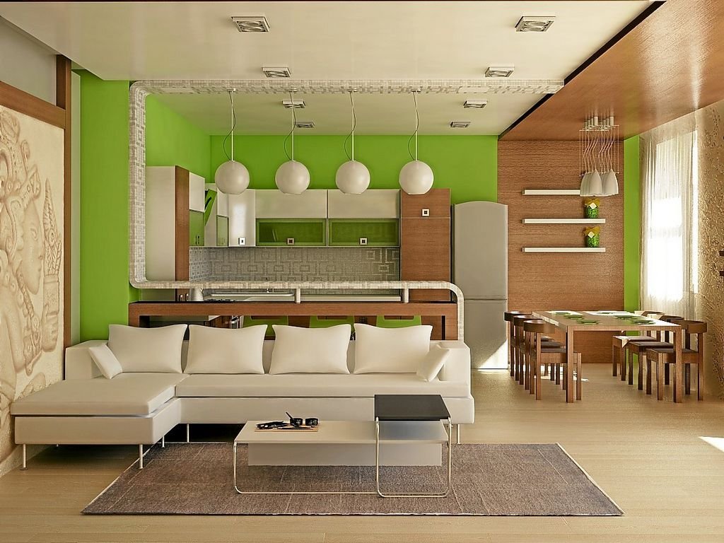 Найбільш популярними прийомом поділу простору є створення «кухонного острова». Він передбачає часткове перекриття простору кімнати барною стійкою або ж поділ кольорів. При виборі відтінків необхідно пам’ятати, що вони повинні поєднуватися один з одним, так як в противному випадку приміщення буде виглядати відштовхуюче.