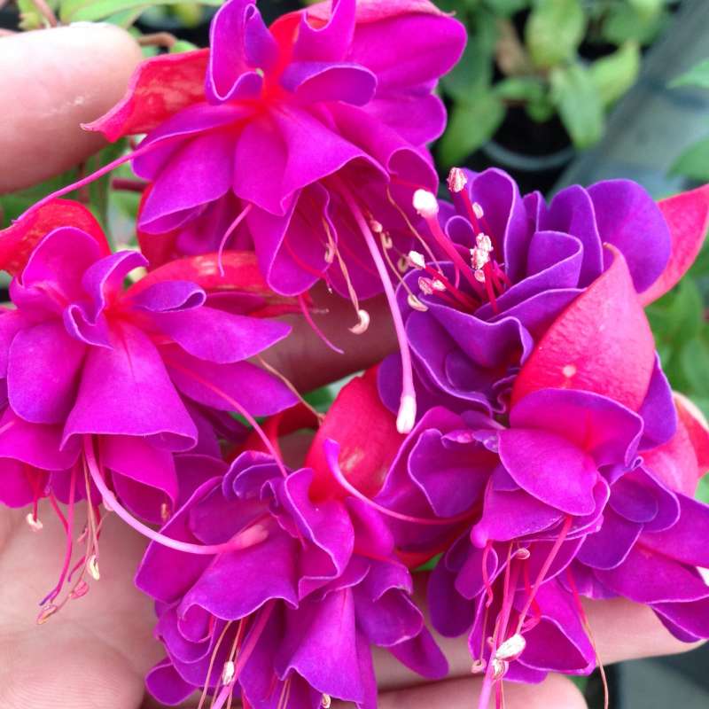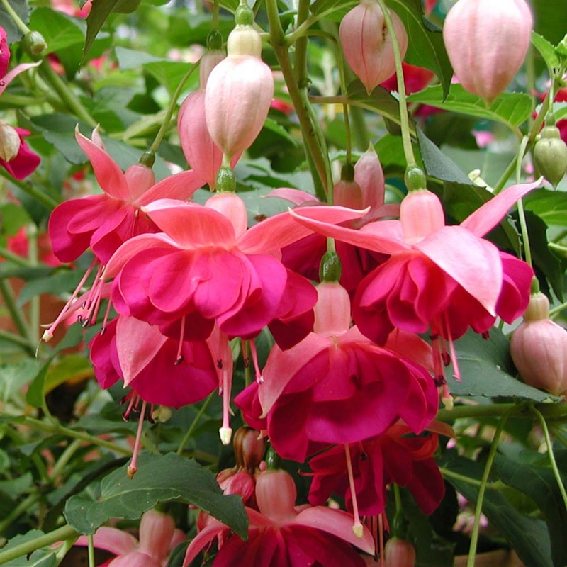 Гібридні сорти фуксії зовні являють собою кущ невеликих розмірів (заввишки 40-80 см) з незвичайною формою квітів, досить хвилясті і пишні. По колірній гамі, можна придбати екземпляри від білого до пурпурного забарвлення, від синього до фіолетового. Це компактна рослина при дотриманні основних правил догляду не доставляє ніяких турбот навіть початківцям квітникарям.