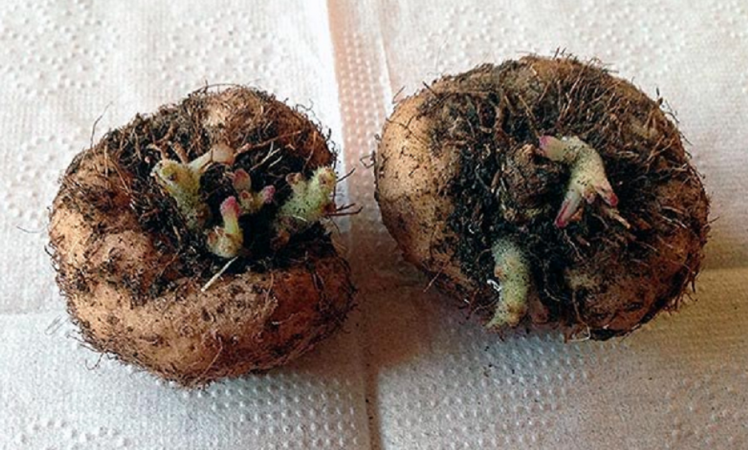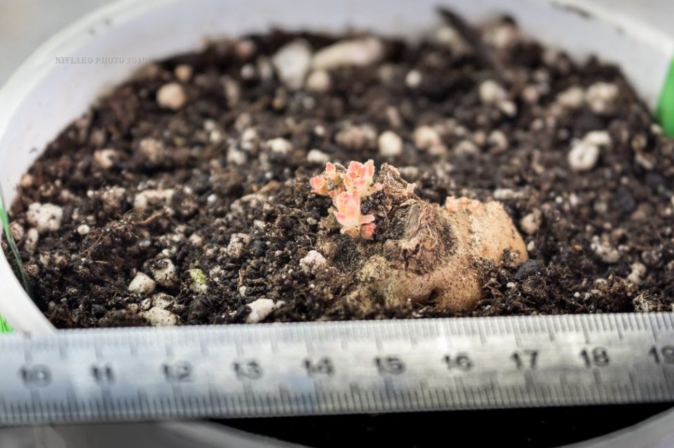 Після ділення частини бульби перед самою посадкою обробляємо рожевою марганцівкою і висаджуємо у відому торфово-піщану суміш, додавши до неї 2 частини піску і 1 частина листової землі. Не зашкодять і 30-50 г гумусу або перепрілого гною на кожен кг. грунту.