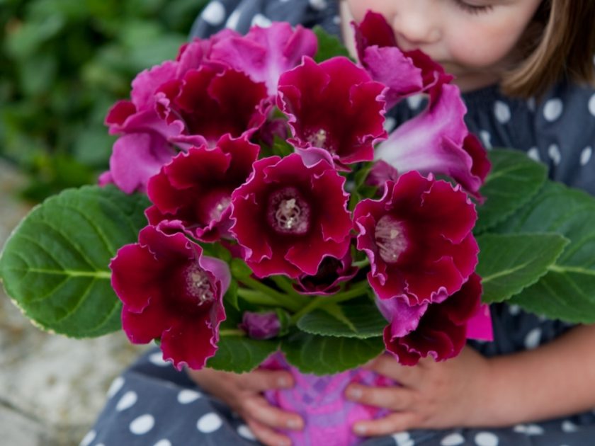 - Глоксинія Прекрасна (Gloxinia Speciosa) з чашечками квітів найрізноманітніших відтінків, обов’язково світлої серединкою і тонкою білою окантовкою кожної пелюстки.