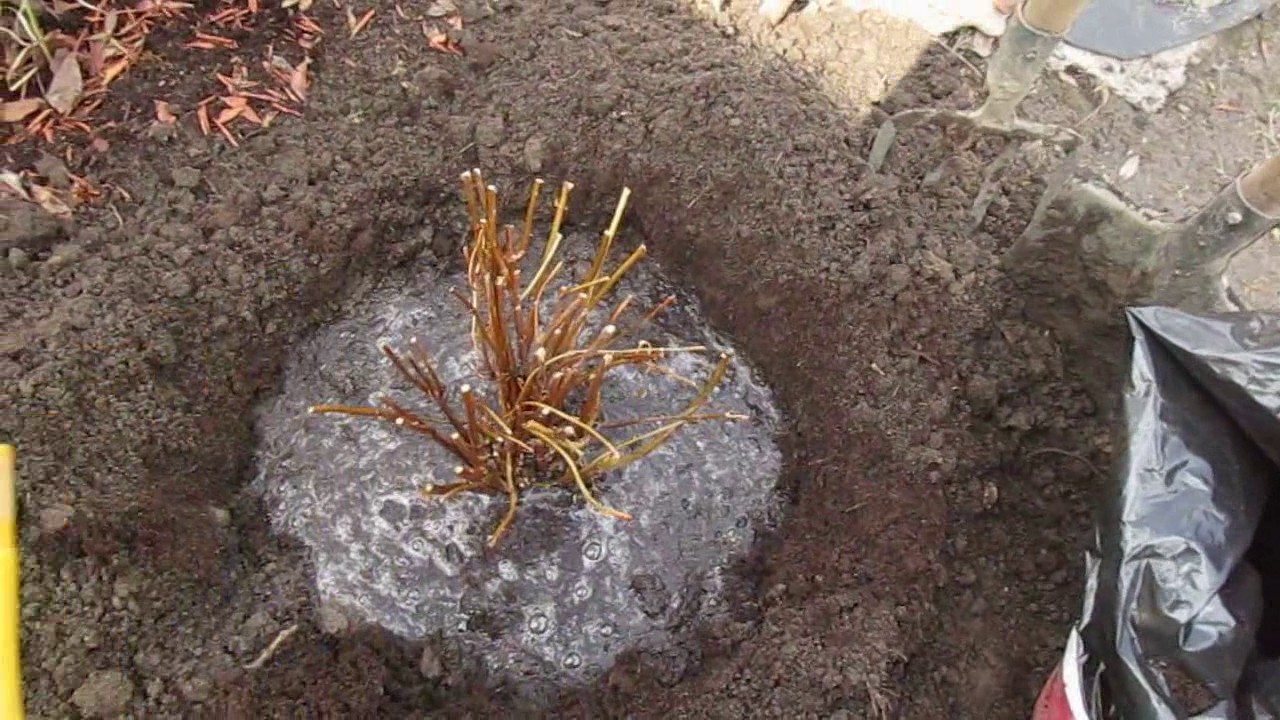 Після розміщення кусточка, рясно поливаємо «конструкцію», щоб корінці розляглися по горбку.