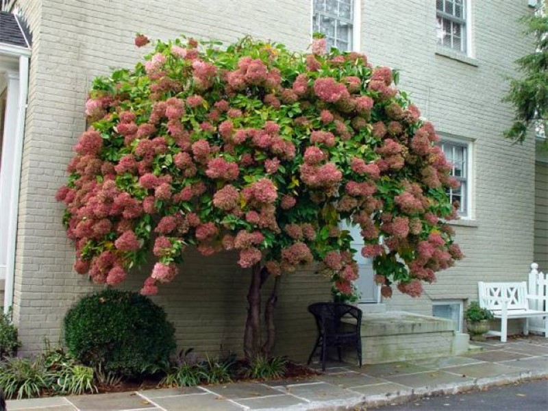 Взагалі-то правильна назва – гортензія Бретштейдера. Завдяки властивості висловлювати свої пагони в щільний кокон» з кори, ця гортензія витримує і мороз, і засуху. Навіть тінь не завадить цього куща покритися біло-рожево-пурпуровими суцвіттями з липня по вересень.
