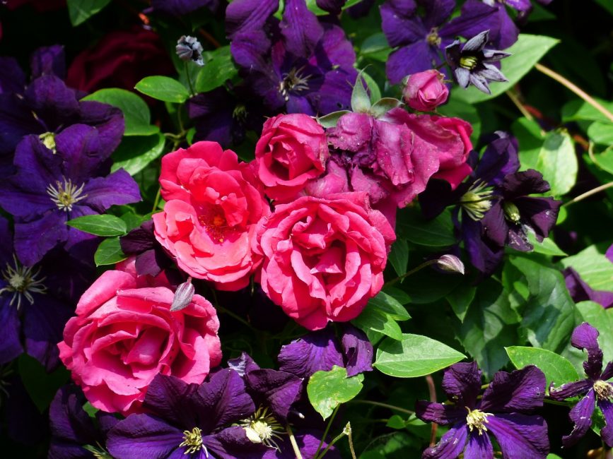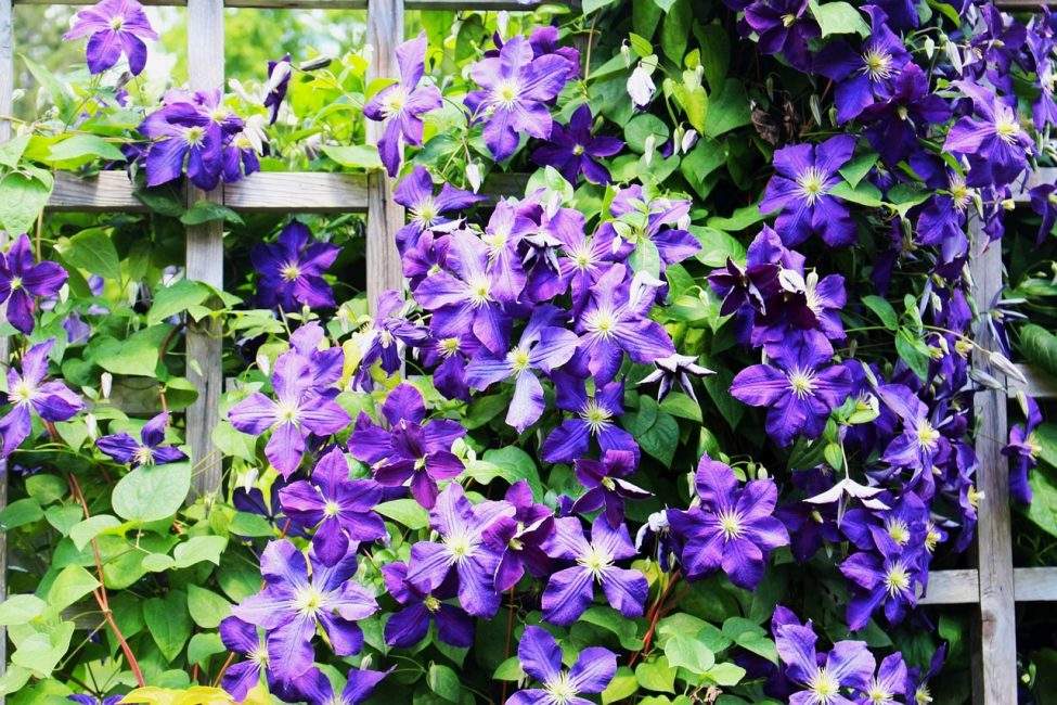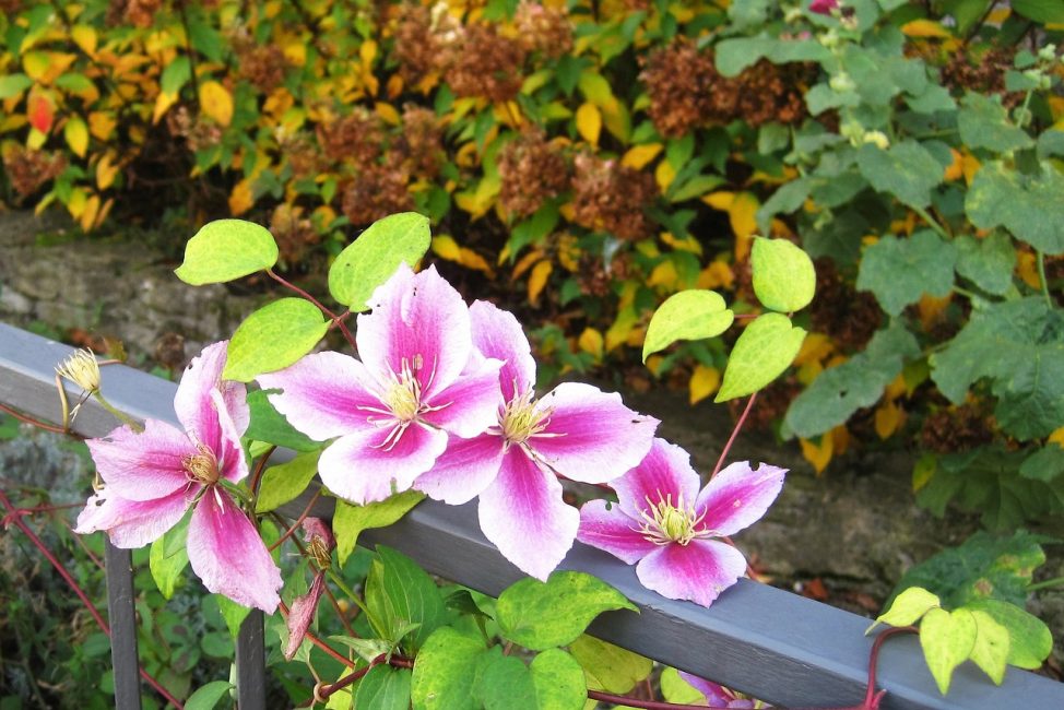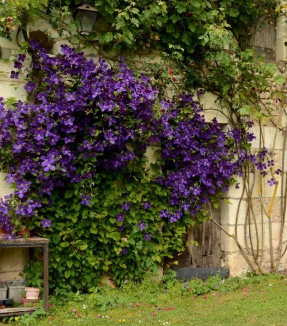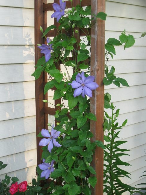 Клематиси чудово гармонують з іншими рослинами, не обов’язково плентаються.
