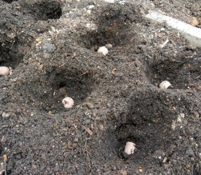 Розкладають по лунках картопля, вносять жменю компосту, закривають посадку землею за допомогою лопати або грабель. Зверху можна рівномірно розкидати золу. Виконання гребенів відбувається з використанням мотики, їй же формують своєрідні гірку, в якій розташовують насіння по заглибинах. Відстань між посадочними лініями дорівнює 70 див.