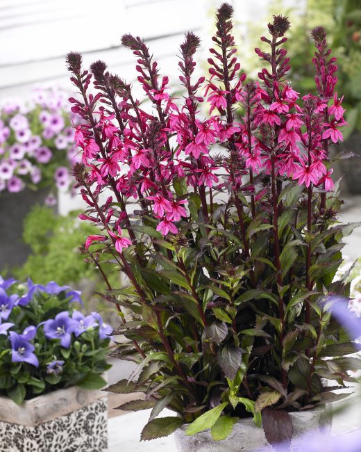 Багаторічний вид лобелії відрізняється від звичного нашому оку рослини кольором і формою куща. Стебла у неї прямостоячі, квіти яскраві, але їх небагато.
