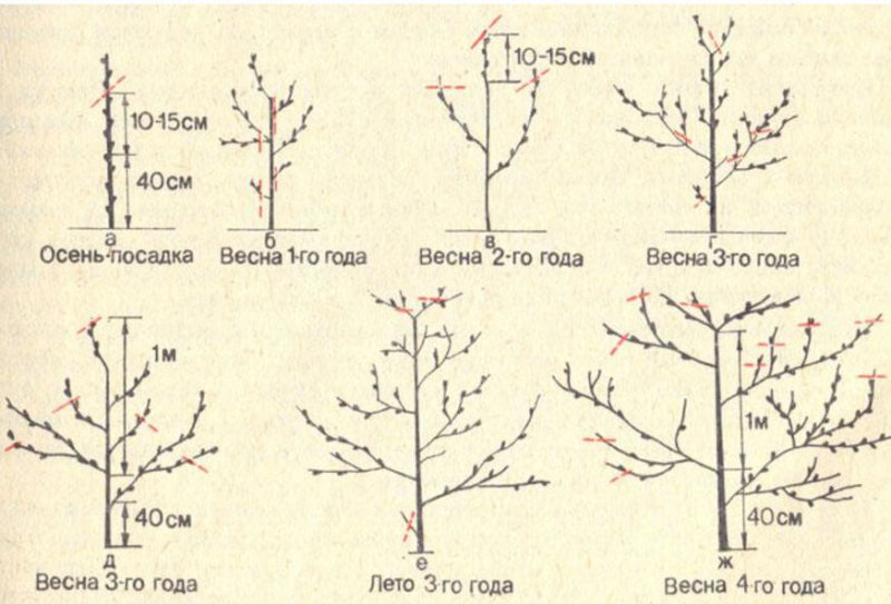 - Починати весняну обрізку необхідно до того, як активізується активний рух соку, а нирки почнуть розвиватися. Цей період припадає на середину березня. Мета обрізання у весняний період полягає у формуванні двох’ярусної крони дерева. При цьому перший ярус складається з 7 – 10 великих гілок, а другий – з 2 – 4 молодих гілок. При зменшенні висоти крони рекомендується вкоротити верхні гілки таким чином, щоб загальна висота дерева не перевищувала 4 метрів. Крім цього під час обрізки навесні також слід видалити всі обморожені або пошкоджені в зимовий період гілки.
