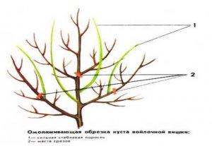 При цьому ліквідуються всі хворі гілки і ті, які надмірно розрослися. Ті гілки, які ростуть з самого стовбура. Обрізати не варто, їх залишають формувати крону. Ті гілки, що ростуть усередину, необхідно обрізати. У вишневих кущах рекомендується скорочувати пагони, які інтенсивно ростуть вгору.