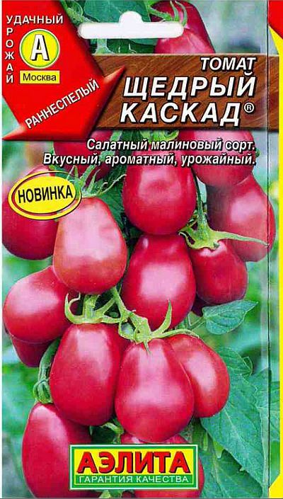 Оригінатор сорту томату Щедрий каскад – ТОВ «Агрофірма АЕЛІТА». Сорт ранньостиглий, від сходів до плодоношення проходить 100-110 днів. Рослина детермінантні, досягає висоти 1 м. Після утворення 6-й кисті кущ завершує зростання.