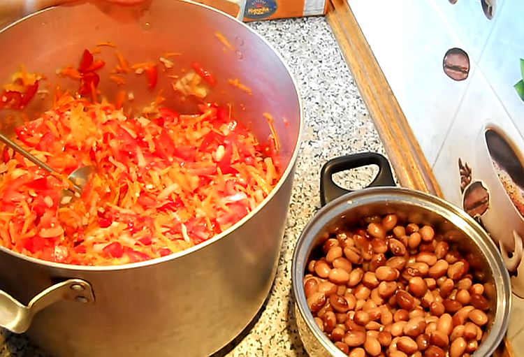 У глибокому посуді розігріти олію. Обсмажити цибулю, моркву і перець. Влити томатну масу, довести до кипіння. Через 5 хвилин додати в заправку боби. Кип’ятити на вогні близько 8 хвилин.