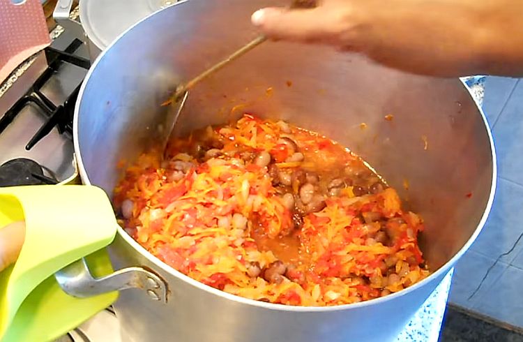 У казан з товстим дном опустити квасоля з помідорами, і тушкувати півгодини. В окремому посуді готувати солодкий перець, моркву і цибулю в маслі з цукром. Овочі повинні бути м’які.