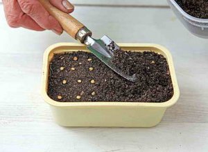 - Сіємо сіянці в коробки або секції по 2 насінини. Температура в парнику не повинна падати менше 22С. Впливати на ріст кореневища, після того як проклюнулися сходи, слід на 6 день, знизивши температуру до 12С. З пророслих паростків залишається один міцний, а кволе видаляємо.