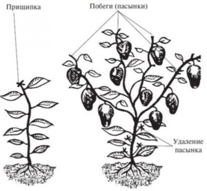 Коли кущ доріс до 23 див., видаляємо верхівку основного стебла. Потім бічні відводки активно йдуть у ріст і формується зручний кущ. Нижні пагони відрізають, залишають близько 5 шт. найсильніших і великих відростків зверху рослини.