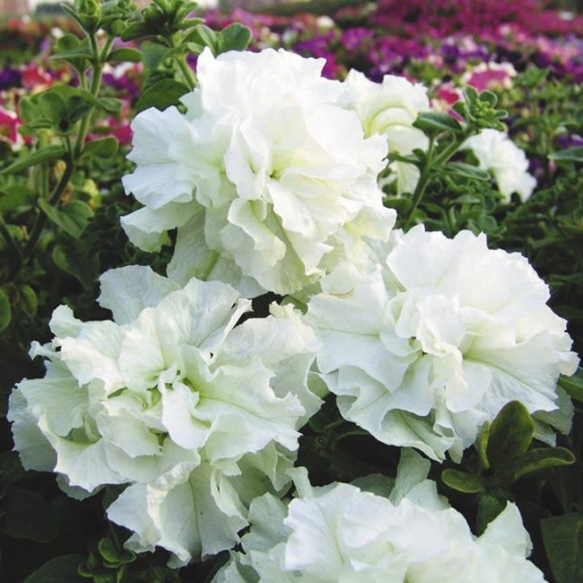 - Білосніжна розсип великих махрових квіток гібридного сорту Соната F1.