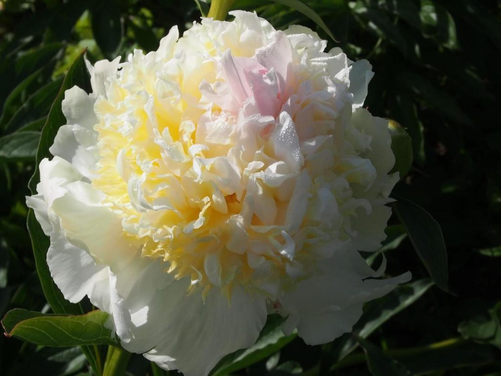 - Півонія трав’янистої виду. Пелюстки махрові, багаторядні, білого або біло-жовтого кольору. Висота рослини досягає 90 см, діаметр квітучої частини – до 22 див.