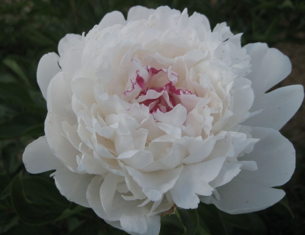 - Пелюстки махрові, колір – білий, тільки серцевина має рожевими чи фіолетовими окантовками по краях. Цвітіння одноразове, але дуже ефектне: за рахунок великих розмірів квітки і декількох бутонів на стеблі, іноді за квітами не видно листя у верхній частині куща.