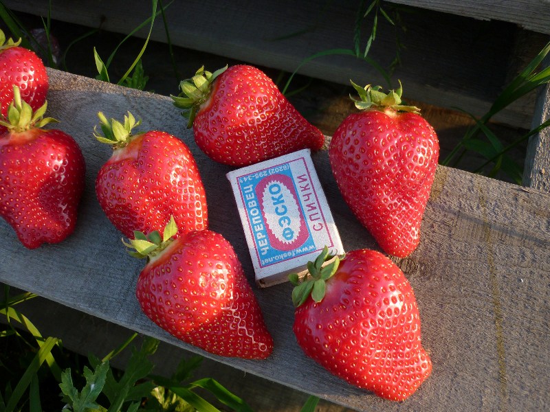 Розмір плоду досить-таки великий, середній вага складає в середньому 30 м, деякі можуть бути важче. Яскраво-червоного відтінку. Форма ягоди правильна, трохи видовжена, одновимірна. Смак солодкий з слабкою кислинкою, м’якоть пружна, соковита, м’ясиста. Росте у висоту до 30 см, лист великий яскравого малахітового кольору.