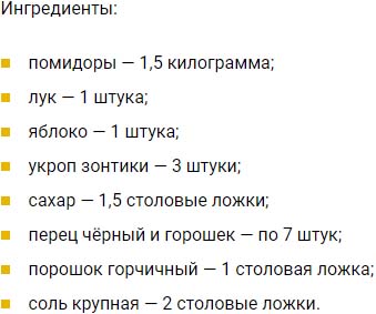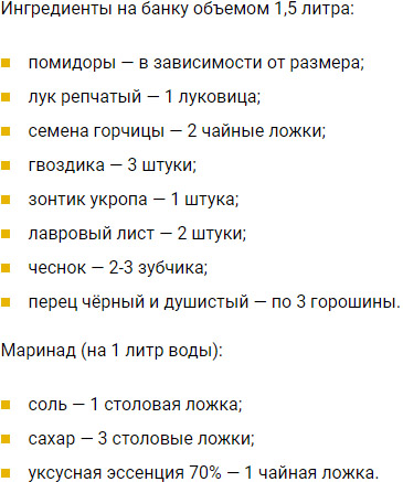 Відмінна закуска не тільки для зимового меню. Відмінно підійде до картопляного пюре і м’ясних страв. Нижче представлений рецепт соління помідорів з гірчицею на зиму.