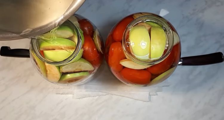 Укладати в тару щільно помідори, чергуючи з часником. Половинки цибулі і яблук також вмістити в тару. Додати спеції. Заливаємо окропом рівно на 10 хвилин.