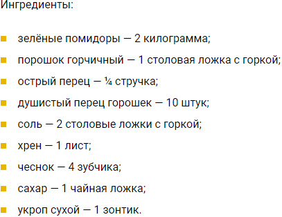 Нестиглі плоди помідорів успішно консервують з прянощами. Виходить сильна закуска, яку обов’язково оцінять любителі гострих страв. Пропонуємо цікавий спосіб заготівлі зелених помідорів з гірчицею на зиму.