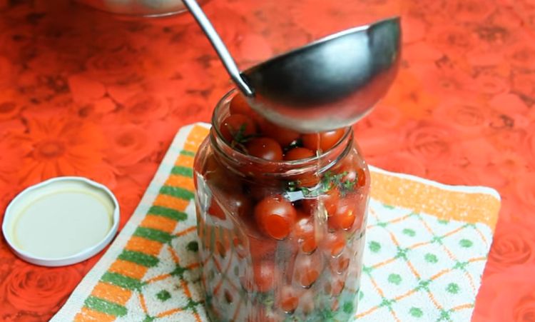 Краще використовувати дрібні плоди томатів. У стерильні банки закласти овочі і залити крутим окропом. Через 10 хвилин злити воду.