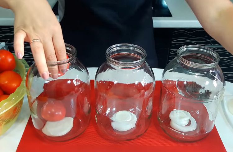 Помідори помити, видалити плодоніжки. На дно склотари покласти спеції: листя хрону, смородини, базилік, кріп. За бажанням додати часник або цибулю. Томати акуратно закласти в банку.