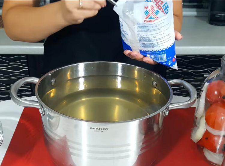 Після закінчення часу злити воду і приготувати маринад. Додати сіль і цукор і закип’ятити. Заливаємо гарячим маринадом овочі і закрити кришками. Заготовки на зиму укутати ковдрою на добу.