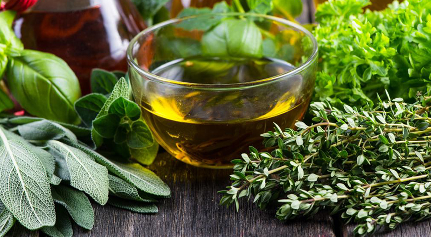 Оливкова олія в оточенні італійських трав: розмарину, чебрецю, орегано.