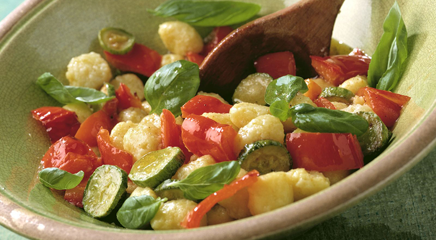 Змішавши всі інгредієнти, приправити сіллю і перцем, прикрасьте гілочкою базиліка або майорану. Замінити незвичайні італійські «галушки» можна стандартними грінками, таке поєднання не тільки поживним, але й задовольнить естетичні потреби гурманів.