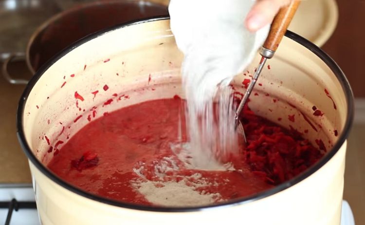Змішати в каструлі масло і помідори, довести до кипіння суміш. Всипати тертий буряк і половину вказаної кількості оцту (40 мл). 10 хвилин тримати на вогні.