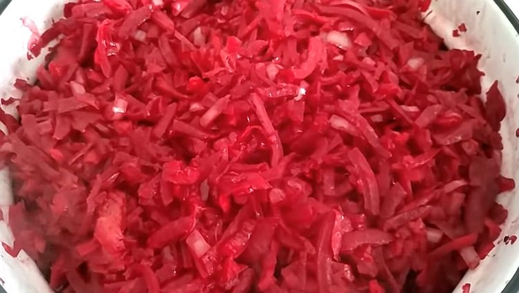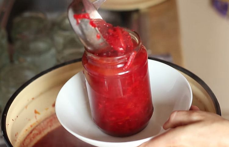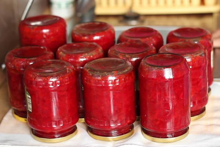 Банки стерилізувати в окропі, так само як і кришки. Розкласти бурякову заправку в банки.