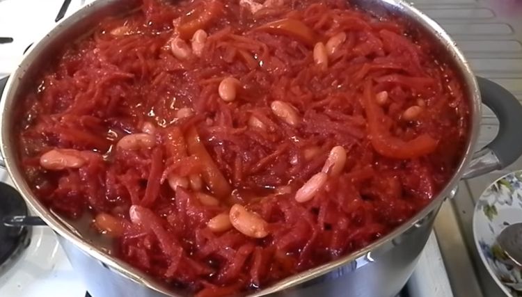 Після додаємо цибулю і моркву. Через 10 хвилин покласти солодкий перець і варену квасолю. Консистенцію посолити, посипати перцем і варити на слабкому вогні ще 15 хвилин. В кінці приготування влити залишився оцет.