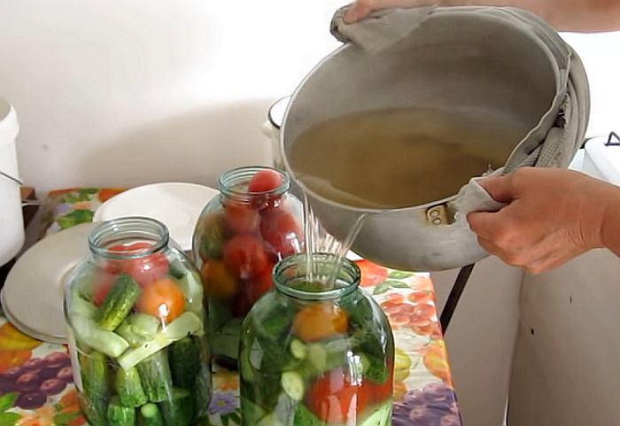 Цей спосіб заготівлі передбачає дворазову заливання окропом. Такий варіант консервації дозволяє уникнути складного процесу стерилізації банок з соліннями.