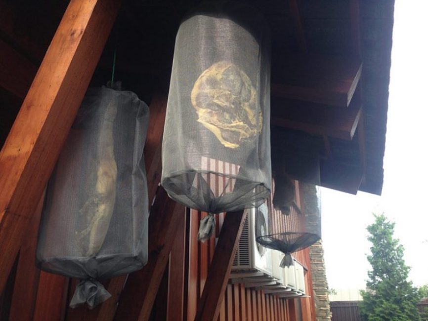 - У літню пору року днем знімайте м’ясо і ховайте в холодильник, а вночі подвешивайте знову для сушіння.