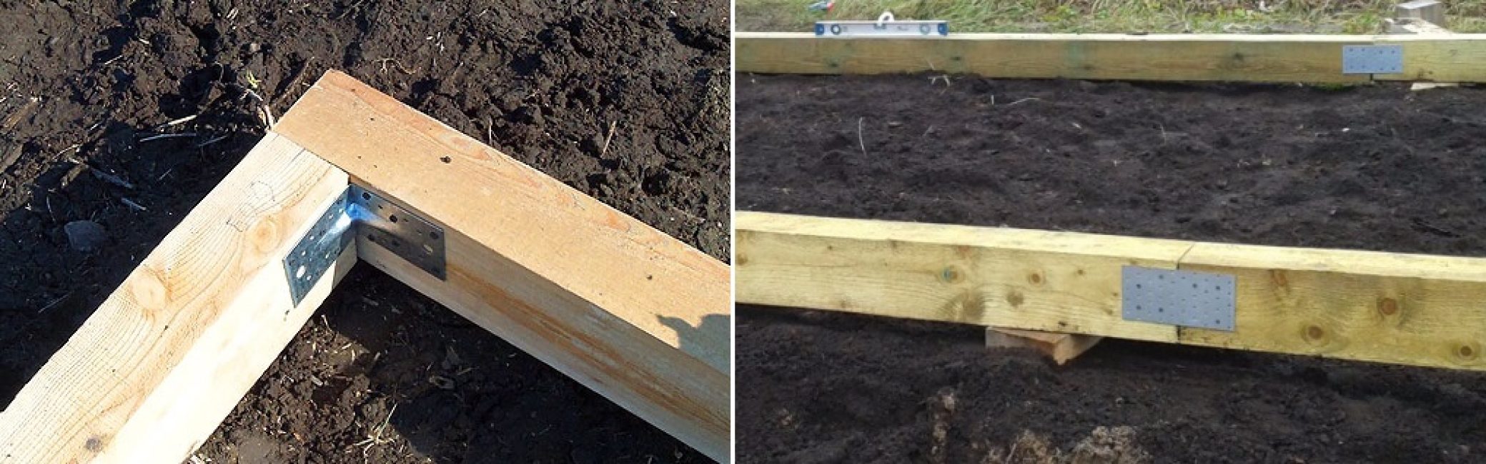 - Для додаткової стійкості майбутньої теплиці в дерев’яному брусі висвердлюються отвори діаметром від 10 до 15 мм. В них у подальшому будуть убиватися металеві фрагменти арматури або товстостінної труби. Можуть використовуватися обрізки профільної труби, прикріпленої до внутрішньої сторони бруса за допомогою саморізів.