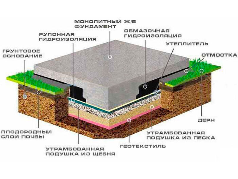 Плитний фундамент передбачає пристрій цільно залитій майданчики поверх шару грунтовки. Використовується в місцевості, де пролягають підземні води або великий відсоток піщаної складової.