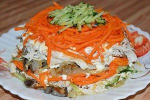 Гриби підійдуть будь-які, але найкраща варіація – печериці. Щоб салатик виглядав красиво, вибирають светленькие екземпляри. Плоди добре промивають. Відварюють цілими, зануривши у киплячу воду із сіллю. Кип’ятять 10 хвилин.