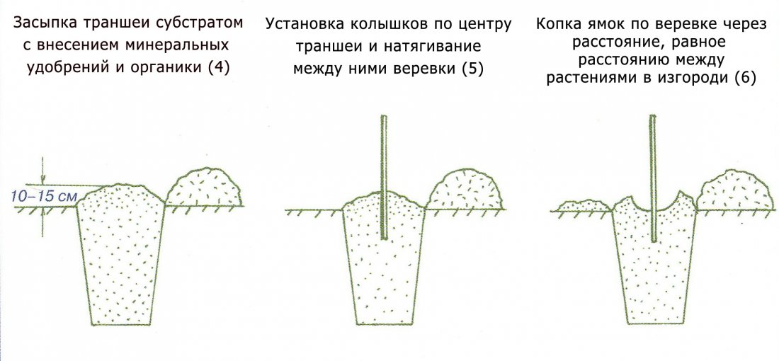 Роблять розмітку. Можна самостійно вирити рів або скористатися послугами техніки, щоб отримати ями діаметром і глибиною не менше півметра. Якщо виникло бажання висадити огорожу в два ряди, тоді збільшують ширину до метра, якщо в три ряди – до півтора метра. Ширина між свободнорастущими рослинами повинна бути по метру, стриженим форм достатньо 40 см, а бордюрні культури висаджують щодо сортів.