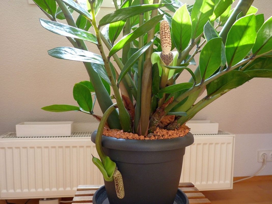 Квітка заміокулькаса схожий на невеликий кукурудзяний качан; його довжина приблизно 5-6 див. Він виростає на окремій стеблової стрілкою і запилюється природним способом. Як правило, в період цвітіння, рослина володіє декількома квітками.