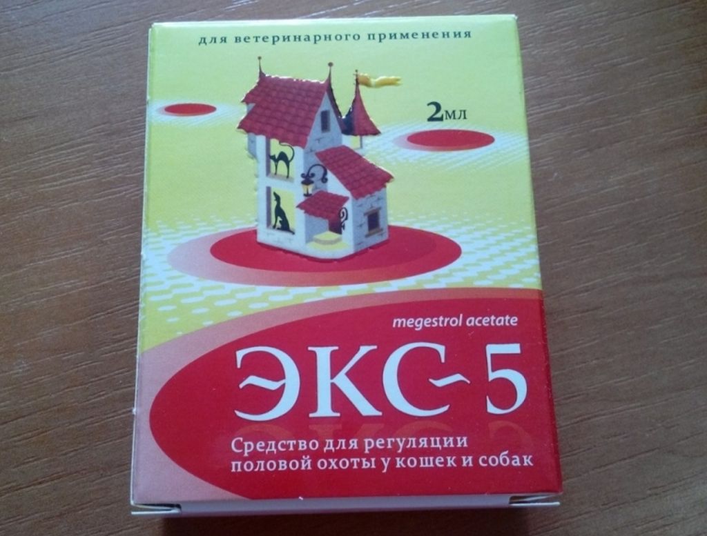 ЕКС-5 з діючою речовиною мегестрол ацетат дається сукам за 1-2 тижні до початку того, як вона буде просити пса. При тривалому застосуванні собака може страждати ожирінням. Не можна давати ЕКС-5 разом з кортикостероїдами. Ціна: 215 рублів.