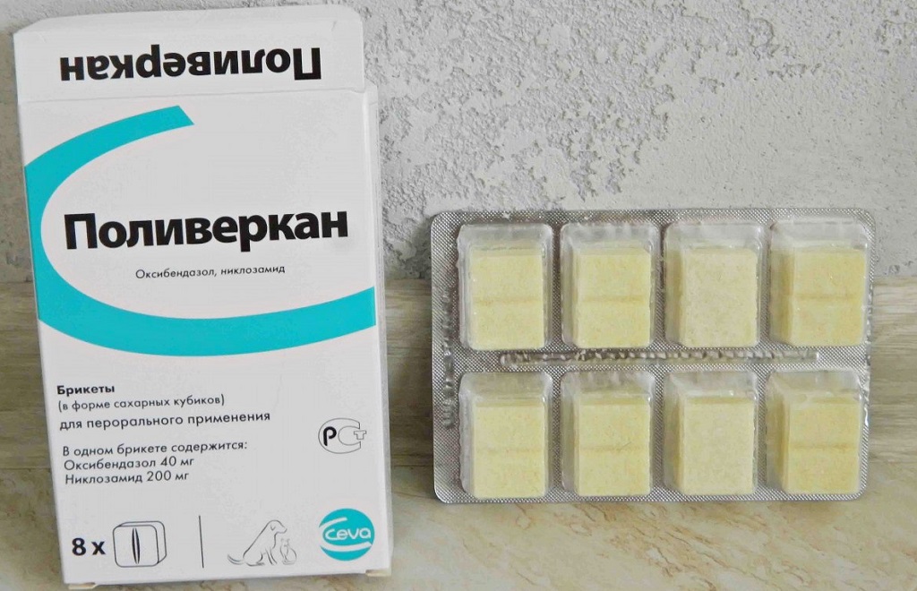 Завдає удару по стрічковим і круглих хробаків. Випускається у формі брикетів, що спрощує розрахунок дозування препарату.