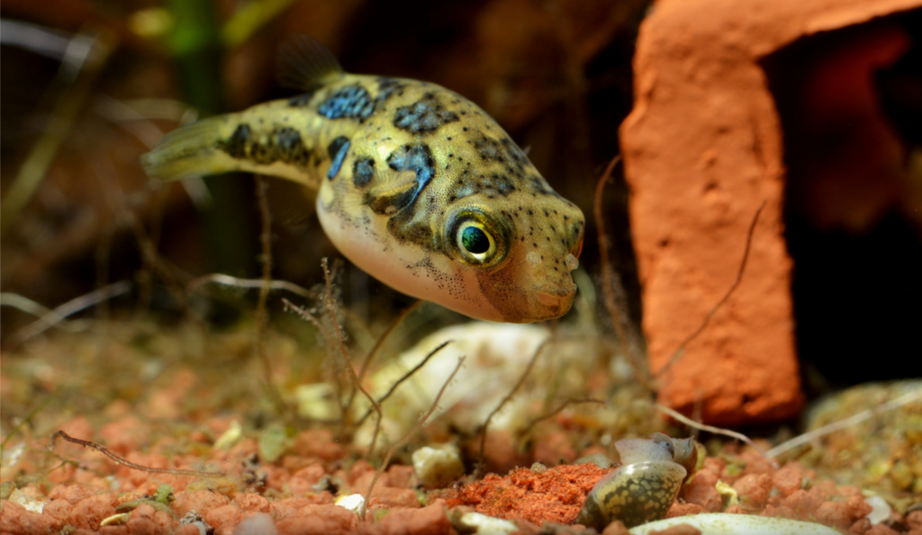 Рибка тетрадон поїдає равликів