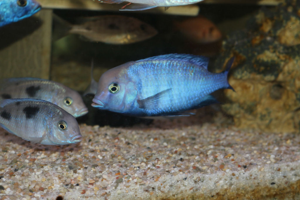 Блакитний дельфін воліє копатися в піску на дні водойми. Рослинність вони розривають або з’їдають, тому її краще не використовувати або купувати рослини виключно з сильною кореневою системою і щільними листами