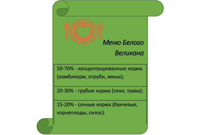 Білі Велетні – великі тварини, відрізняються швидким набором ваги. Для цього вони мають потребу у великій кількості збалансованого харчування. Раціон залежить від статевої приналежності кролика, віку і пори року. Але основне співвідношення виглядає так:
