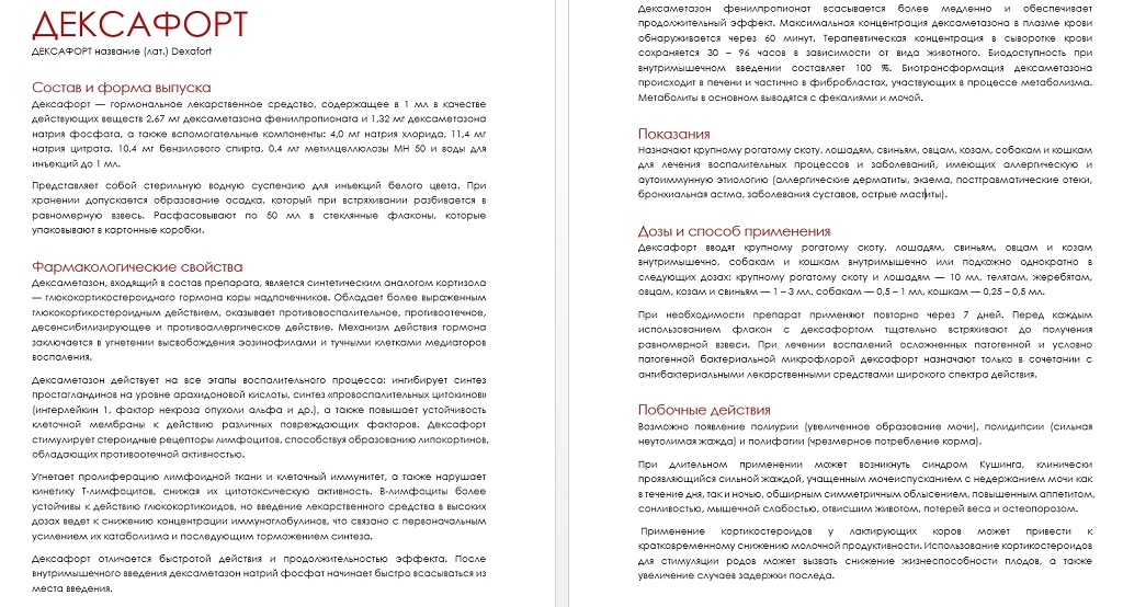 Препарат дексафорт, має чудові лікувальні властивості. Знімає біль, полегшує муки тварин і страждання з господарів. Важливо пам’ятати, що перед застосуванням необхідно проконсультуватися у фахівця. Адже крім позитивних дій, є ще й побічний ефект, і протипоказання.